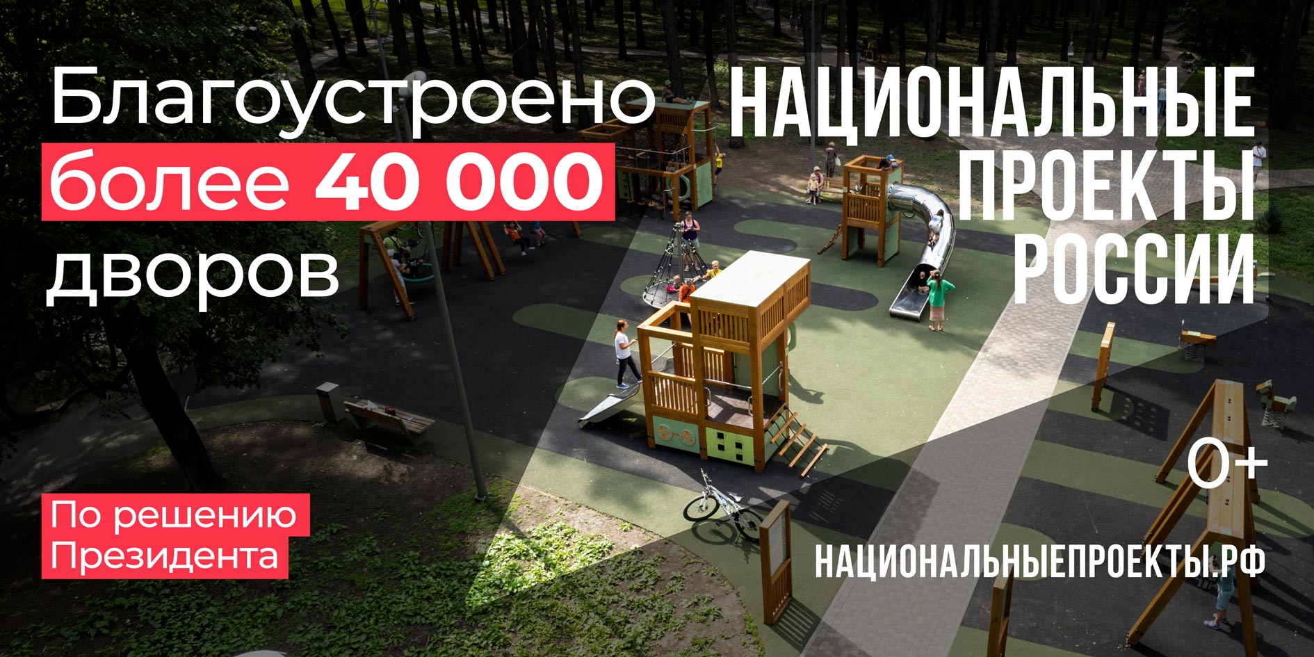 Одно из направлений нацпроекта «Инфраструктура для жизни» – благоустройство общественных пространств. На сегодняшний день преобразили уже 40 тыс. дворовых территорий, что является частью комплексной работы по созданию современной, удобной и безопасной городской среды.