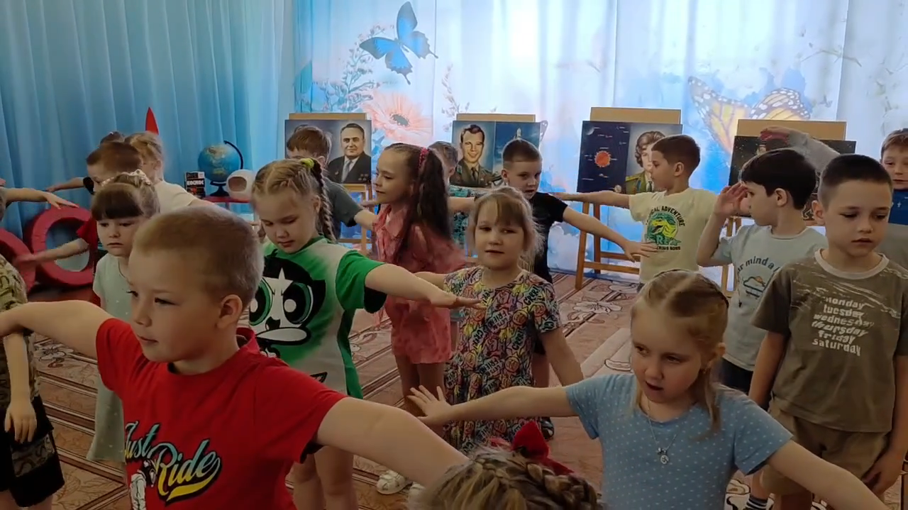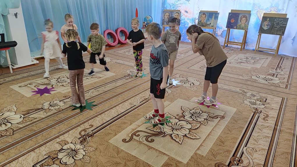 Дошкольники сделали «звёздную разминку», отгадывали загадки о планетах, кометах и чёрных дырах, пели песни о космосе. На космическом челлендже юные космонавты прошли «предполётную подготовку»: проверили вестибулярный аппарат (кружение с закрытыми глазами) и ловкость (сбор космического мусора), а также посмотрели фильм о первом полёте и о современных космических экспедициях.