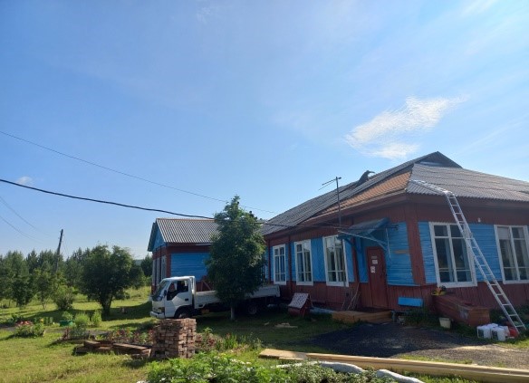На сегодняшний день перекрыто шифером три стороны крыши, частично заменена обрешетка и стропила. Перешли к разбору четвёртой стороны. Работы ведутся с раннего утра до позднего вечера.