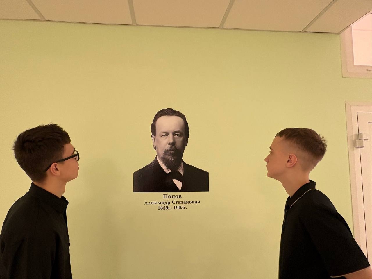- Физика. У кабинетов физики — портреты А. С. Попова и И. В. Курчатова, чьи исследования определили ключевые вехи в изучении физических явлений.