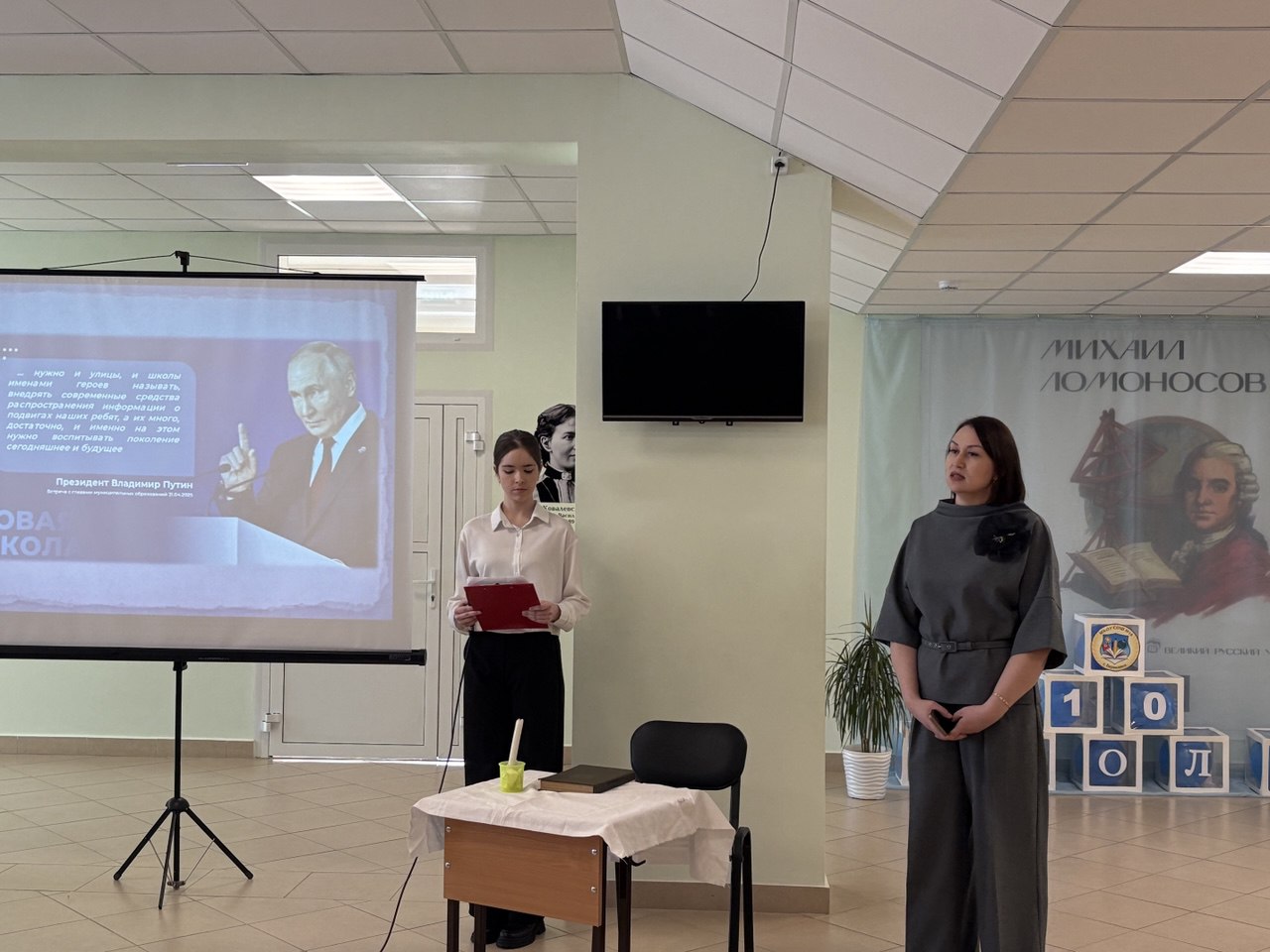 На церемонии открытия собрались ученики, учителя и гости школы. В своих выступлениях заместитель начальника Управления образования Тайшетского муниципального округа Быргина Елена Олеговна и руководитель центра «Точка роста» школы Игнацевич Светлана Владимировна напомнили присутствующим о том, каким примером целеустремлённости и тяги к знаниям остаётся М. В. Ломоносов для каждого поколения.