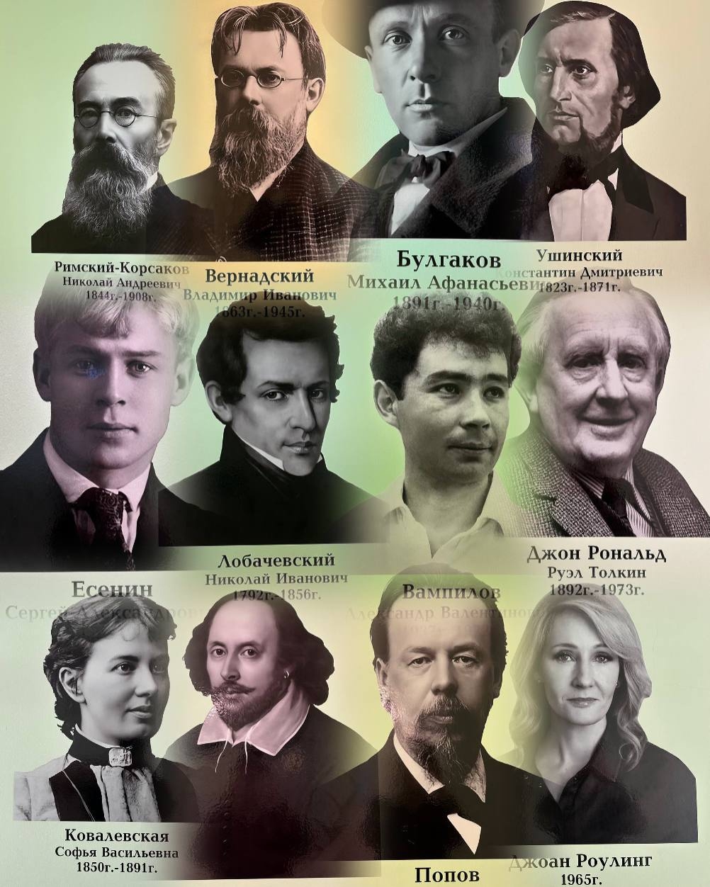 - Литература. Литературные коридоры украшают изображения С. А. Есенина, Дж. К. Роулинг, Дж. Р. Р. Толкина, А. В. Вампилова, М. А. Булгакова и У. Шекспира – мастеров слова, чьи произведения вдохновляют поколения читателей.