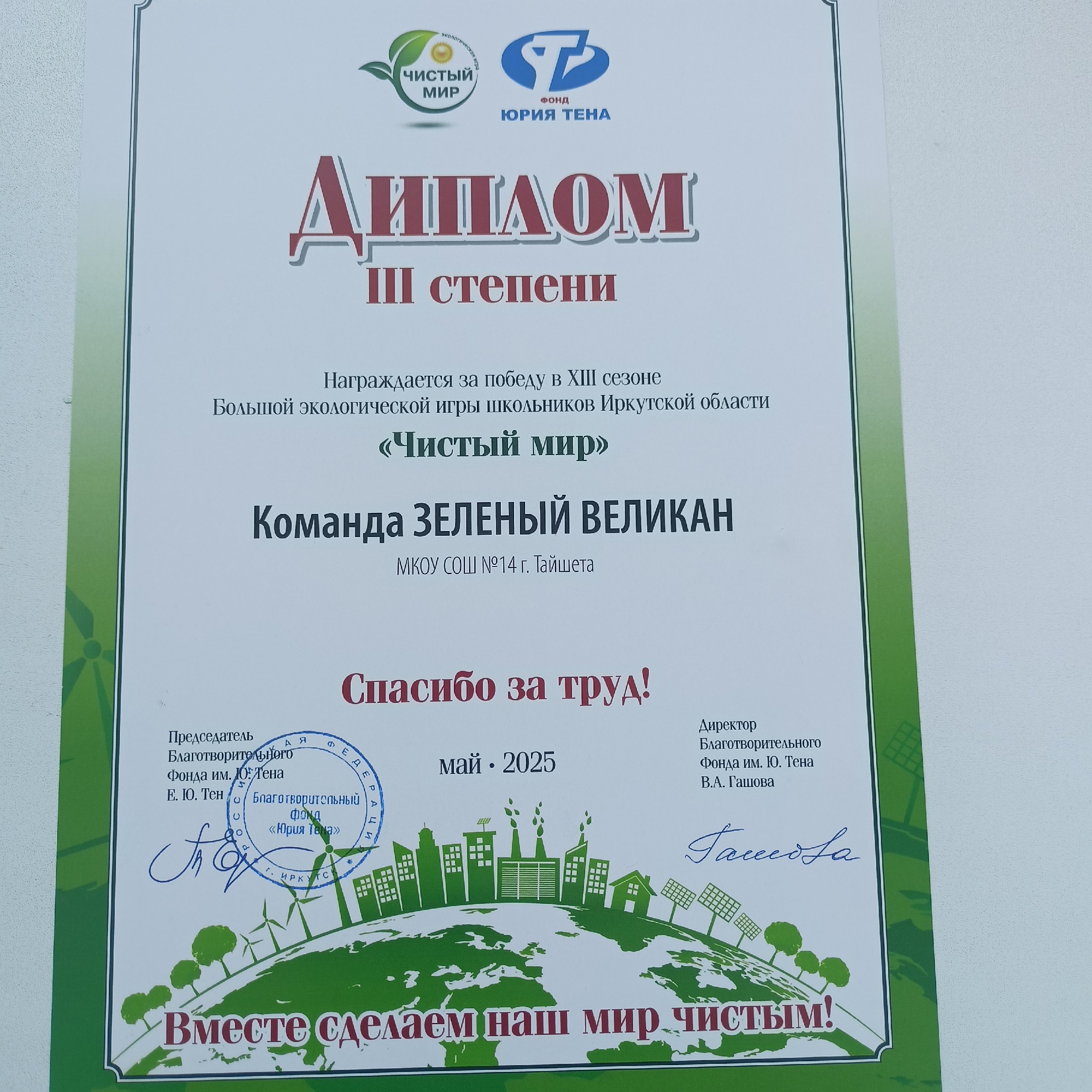 - команда МКОУ СОШ №14 г. Тайшета «Зеленый великан» заняла III место. Состав команды: Вакулко Влада, ученица 10 класса; Габадулина Ксения, ученица 10 класса; Гаранина Алина, ученица 10 класса; Грешилова Софья, ученица 10 класса; Капарова Баян, ученица 10 класса; Ледник Алёна, ученица 10 класса; Малофеева Олеся, ученица 10 класса; Нурмаматов Санатбек, ученик 10 класса; Пипаш Карина, ученица 10 класса; Поджарый Егор, ученик 10 класса; Смеречинская Александра, ученица 10 класса; Тельных Ангелина, ученица 10 класса; Ходжаева Валерия, ученица 10 класса; Эргешов Умар, ученик 10 класса; Юрак Марина, ученица 10 класса. Руководитель команды – Боротюк Татьяна Сергеевна, учитель химии и биологии.