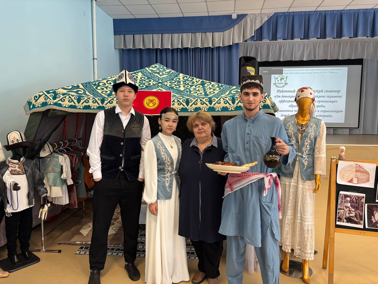 Участников мероприятия приветствовала директор МКОУ СОШ № 14 г. Тайшета Лапцевич Е.Н., которая рассказала, что школа с 2019 года является активным участником регионального инновационного проекта «Адаптация и социализация детей с миграционной историей в образовательных организациях Иркутской области». Школьный руководитель регионального проекта «Дети мигрантов» Татарникова Ю.Ю. озвучила присутствующим основные проблемы, с которыми приходится сталкиваться в ходе интеграции обучающихся с миграционной историей в новое социокультурное пространство, а учащиеся 9 «А» класса Маматалыева Раяна, Эрмекбаев Усман и Абдурахмонов Нуриддин провели экскурсию «Проходите в мой дом», в ходе которой ребята рассказали об особенностях культуры Кыргызстана и Таджикистана.
