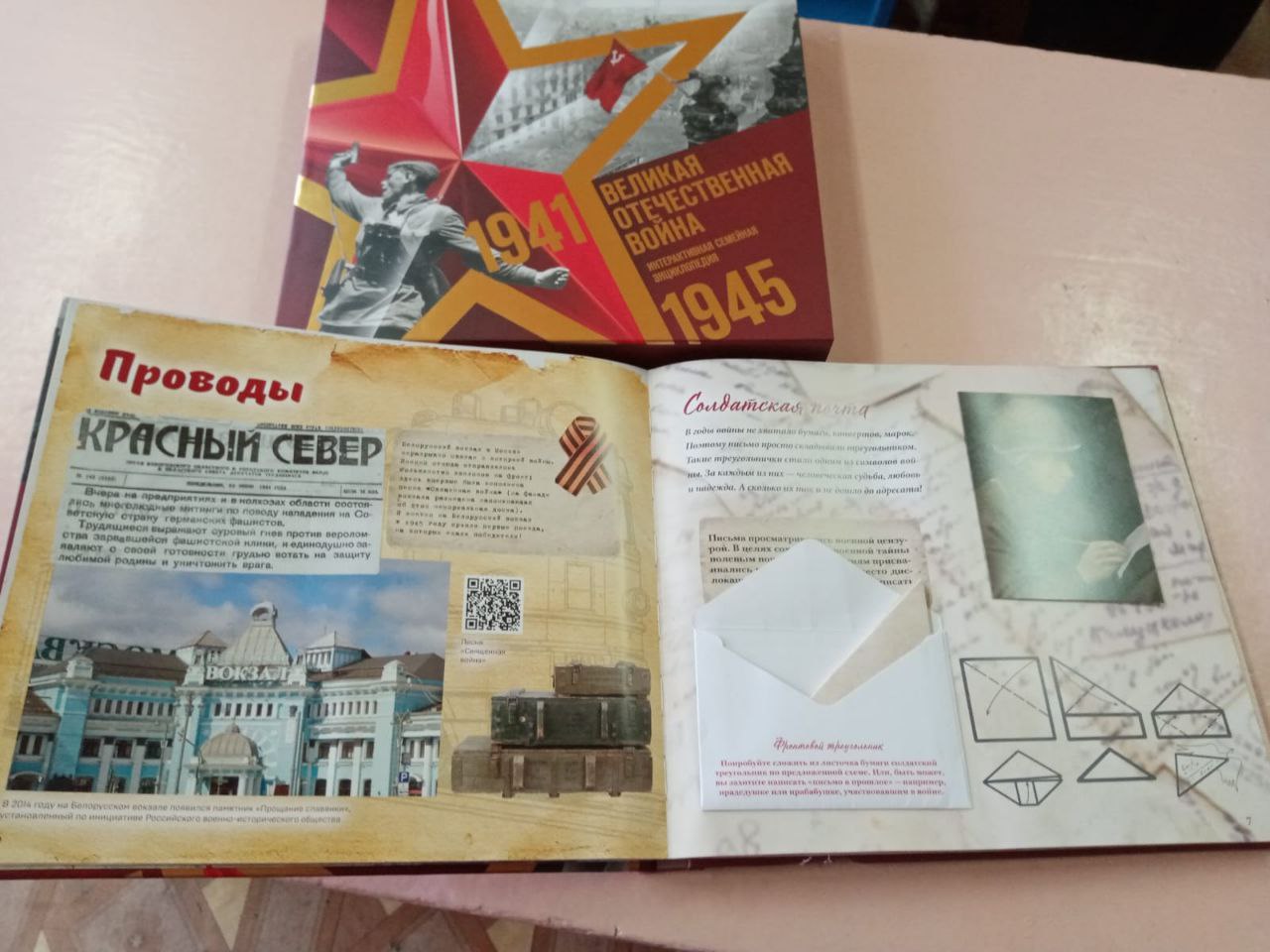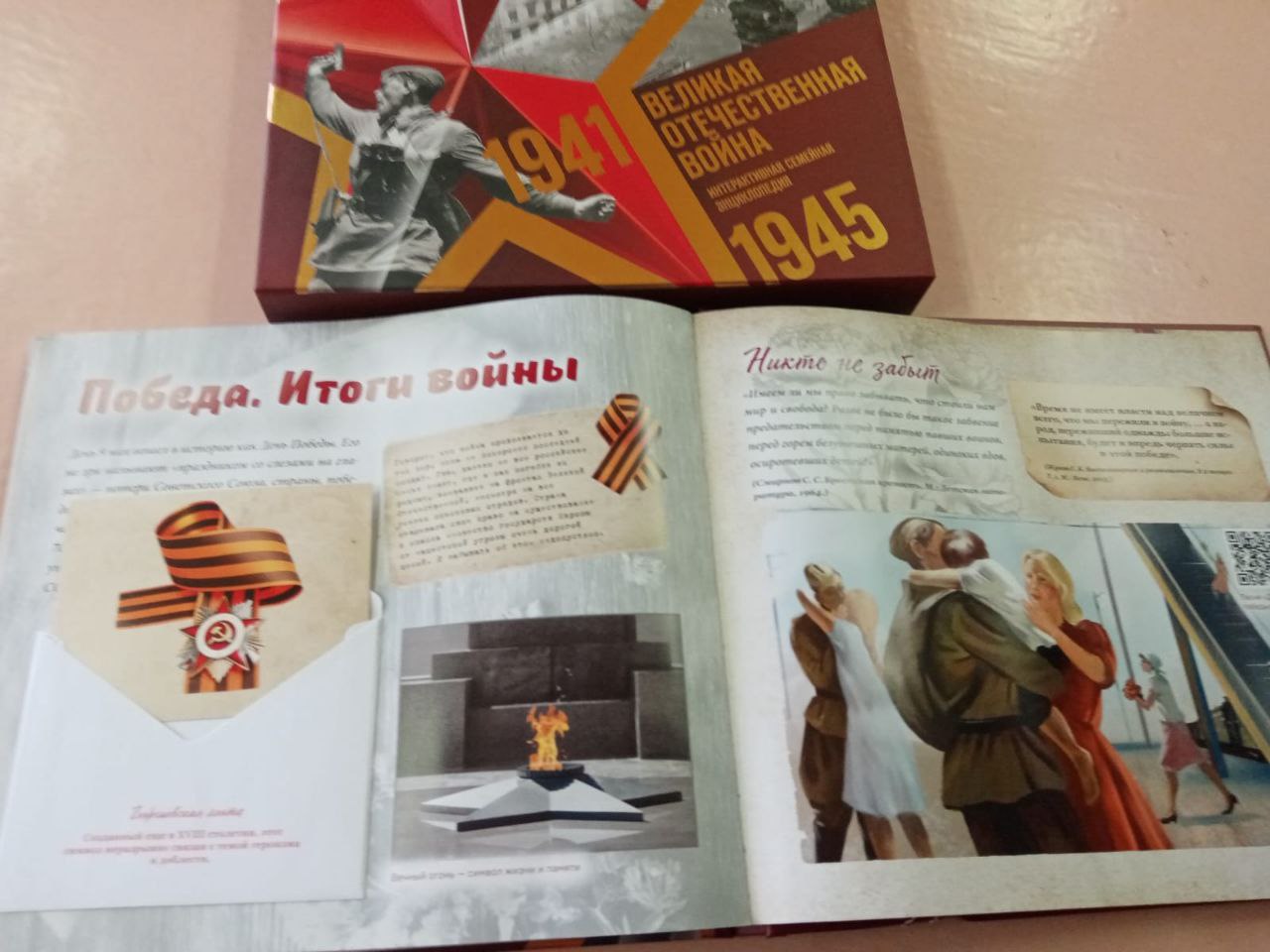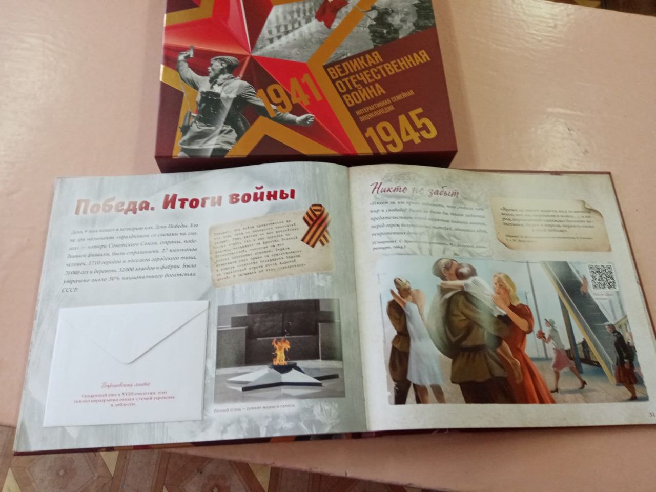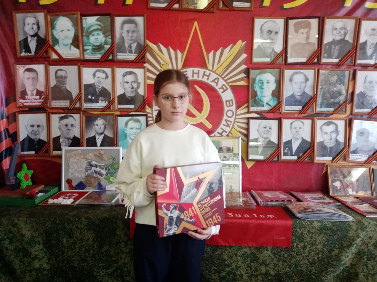 В МКОУ Берёзовской СОШ, в школьном уголке Воинской Славы появилась книга - большая семейная энциклопедия «Великая Отечественная война». Книга наполнена фронтовыми фотографиями и военными картами. Подарила книгу в школьную библиотеку ученица 5 класса Ронжина Анна.